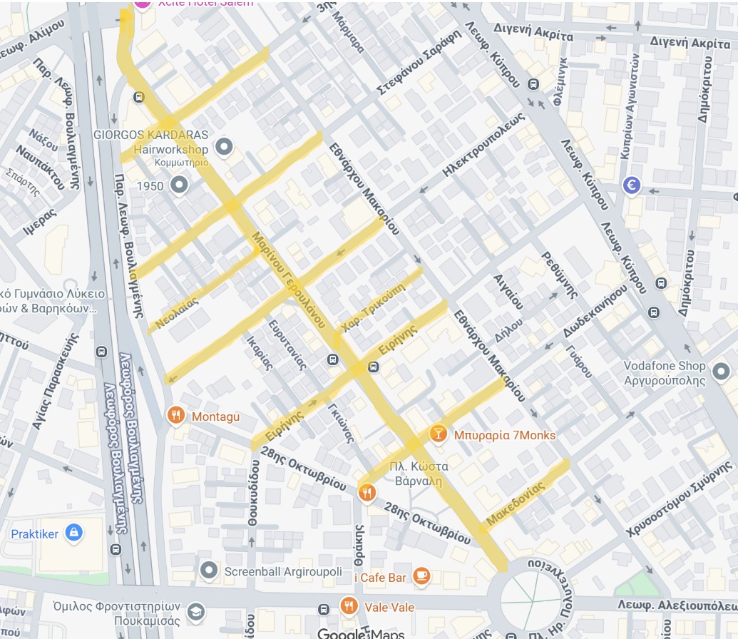 Παράδρομος Βουλιαγμένης (στη συμβολή με τις οδούς Γερουλάνου, 3ης Σεπτεμβρίου, Στ. Σαράφη, Νεολαίας και Ηλεκτρουπόλεως)