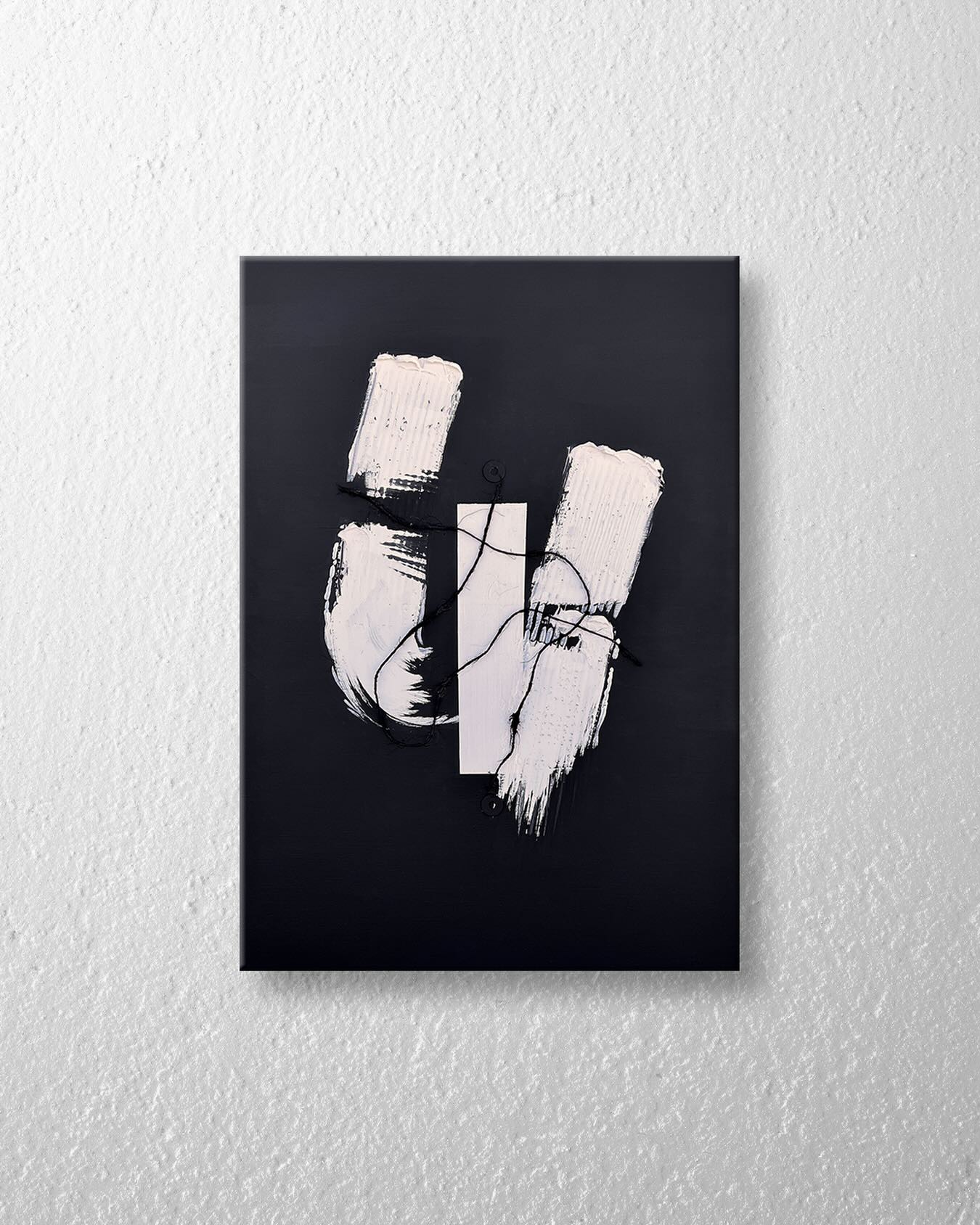Με τη δυαδικότητα να αποτελεί τον βασικό κορμό της έκθεσης, επέλεξα το άσπρο και το μαύρο ως κυρίαρχα στοιχεία, ενώ παράλληλα, δούλεψα πολύ με τις υφές: γυαλιστερές και ματ επιφάνειες, αντιθέσεις στην αίσθηση του υλικού, ακόμη και την προσθήκη χρυσού σε ορισμένα έργα, ως μια υπαινικτική τρίτη διάσταση μέσα στο δίπολο.