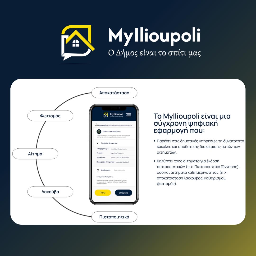 Η εφαρμογή MyIIioupoli είναι διαθέσιμη δωρεάν σε: Google Play (Android) App Store (iOS) και σε Web Περιβάλλον, ενώ περιλαμβάνει τη δυνατότητα να κατατίθενται αιτήματα που αφορούν στην αποκατάσταστη, τον φωτισμό, λακούβες, όπως και αιτήματα για την έκδοση πιστοποιητικών.