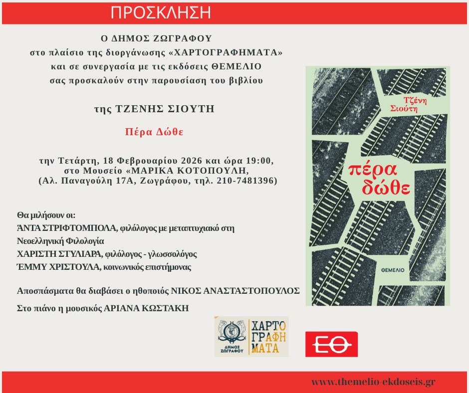 Συνεχίζονται οι παρουσιάσεις βιβλίων μέσω της δράσης «Χαρτογραφήματα» του Δήμου Ζωγράφου, με το βιβλίο της συγγραφέας Τζένης Σιούτη με τον τίτλο «Πέρα δώθε» (εκδ. ΘΕΜΕΛΙΟ), να έρχεται στο Μουσείο Μ. Κοτούλη, την Τετάρτη 18 Φεβρουαρίου και ώρα 19:00.