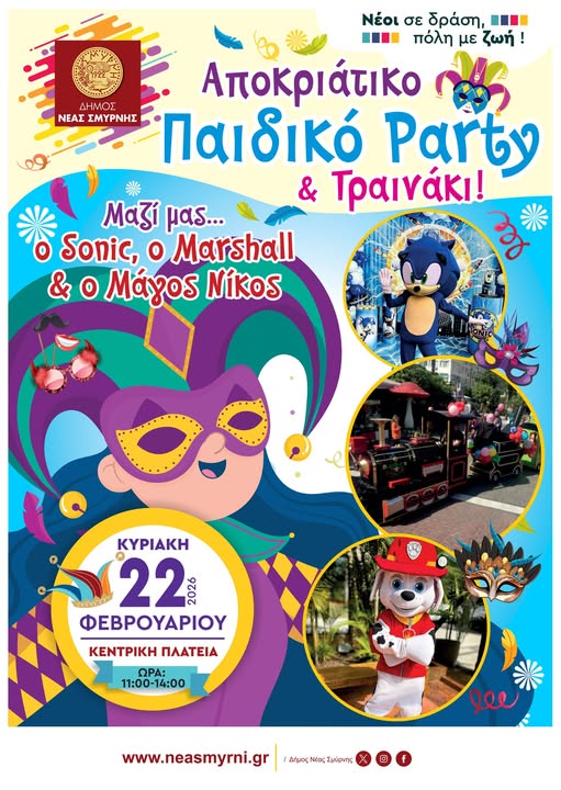 Την Κυριακή 22 Φεβρουαρίου, στις 11:00 π.μ., έχουν την τιμητική τους τα παιδιά: Με ένα μεγάλο αποκριάτικο παιδικό πάρτι και με διαδρομές με το τρενάκι που έχει ήδη βγει στους δρόμους της πόλης και θα παραμείνει εκεί για όλη την περίοδο της Αποκριάς.