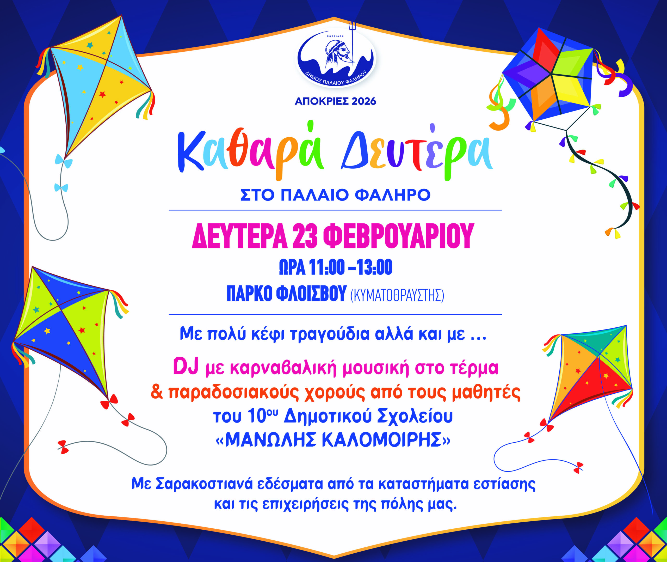 Κέφι, μουσική και παραδοσιακές δράσεις για όλους τους επισκέπτες, σε μία εκδήλωση που περιλαμβάνει: DJ με καρναβαλική μουσική, παραδοσιακούς χορούς από τους μαθητές και τις μαθήτριες του 10ου Δημοτικού Σχολείου  «ΜΑΝΩΛΗΣ ΚΑΛΟΜΟΙΡΗΣ», σαρακοστιανά εδέσματα (προσφορά των καταστημάτων εστίασης και των επιχειρήσεων του Δήμου) και πάνω απ’ όλα φεστιβαλική διάθεση.