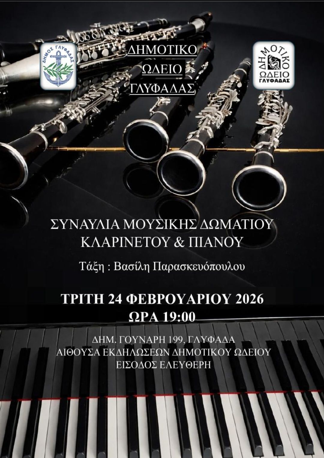 Μία ζεστή μουσική βραδιά, με συναυλία μουσικής δωματίου κλαρινέτου και πιάνου, διοργανώνει την Τρίτη, 24 Φεβρουαρίου, στις 19:00, στην αίθουσα εκδηλώσεών του, το Δημοτικό Ωδείο Γλυφάδας (Δημ. Γούναρη 199, είσοδος από το ΚΕΠ).