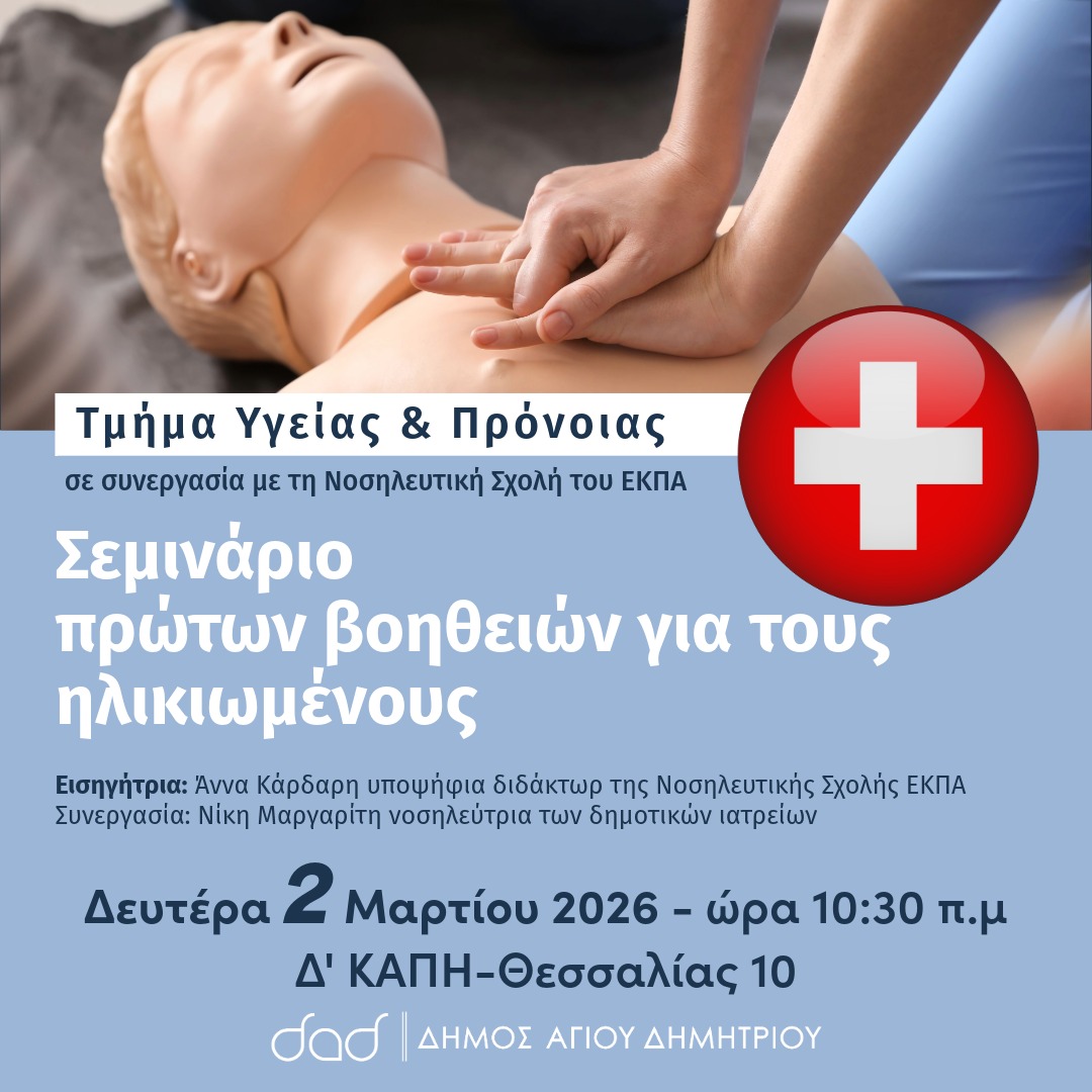 Ένα δωρεάν σεμινάριο πρώτων βοηθειών για τα άτομα 3ης ηλικίας διοργανώνει το Τμήμα Υγείας & Πρόνοιας του Δήμου Αγίου Δημητρίου, σε συνεργασία με το ΕΚΠΑ – Νοσηλευτική Σχολή.
