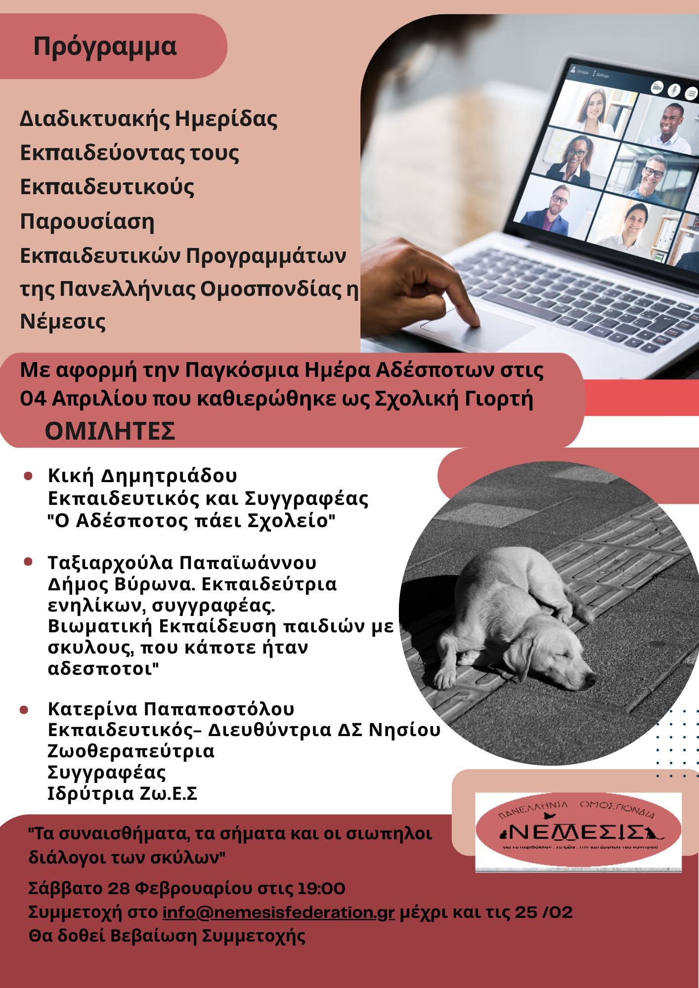 Με αφορμή την Παγκόσμια Ημέρα Αδέσποτων Ζώων στις 4 Απριλίου, η οποία έχει πλέον καθιερωθεί ως επίσημη Σχολική Γιορτή, η Πανελλήνια Ομοσπονδία «Νέμεσις» διοργανώνει μια ενδιαφέρουσα διαδικτυακή ημερίδα.
