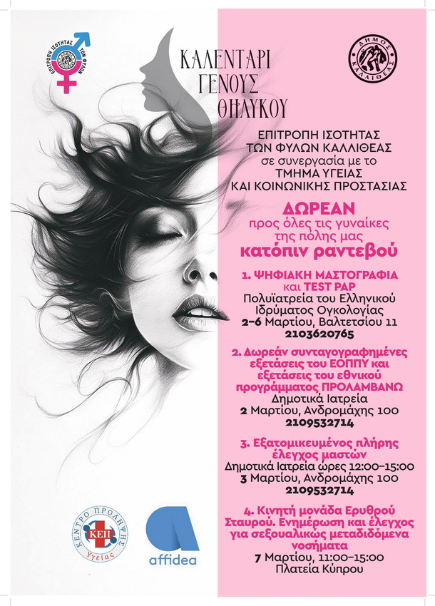 Στο πλαίσιο των δράσεων, η Επιτροπή Ισότητας των Φύλων, σε συνεργασία με το Τμήμα Υγείας και Προστασίας, προσφέρει από τις 2 έως τις 7 Μαρτίου δωρεάν υπηρεσίες πρόληψης και ελέγχου για όλες τις γυναίκες της πόλης. Η πρωτοβουλία αναδεικνύει τη σημασία της πρόληψης και της έγκαιρης διάγνωσης, υπογραμμίζοντας παράλληλα το δικαίωμα κάθε γυναίκας σε ισότιμη πρόσβαση σε ποιοτικές υπηρεσίες υγείας.