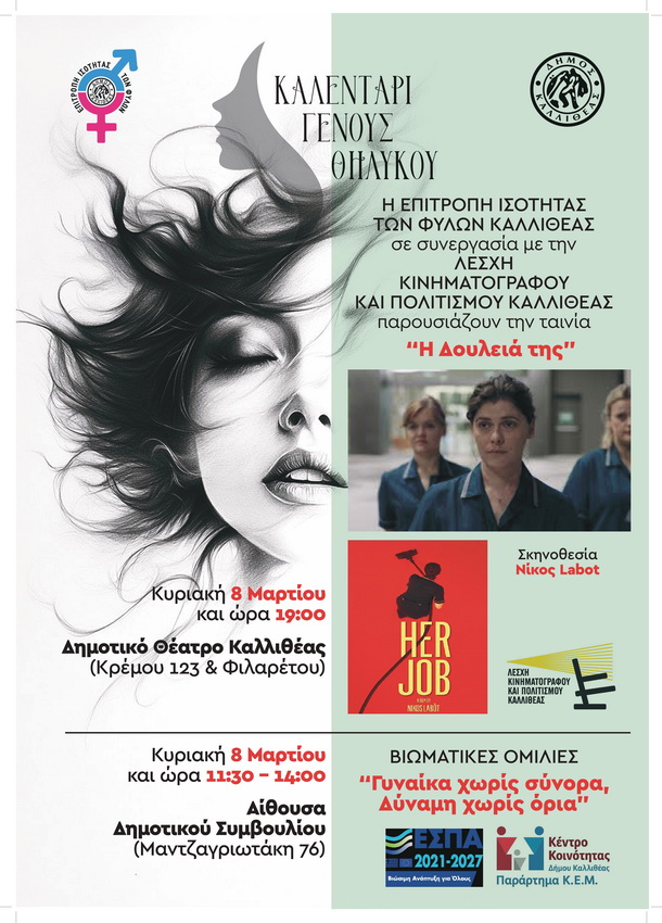 Σε συνεργασία με τη Λέσχη Κινηματογράφου και τον Σύλλογο «Ζωή και Πολιτισμός Καλλιθέας», η Επιτροπή Ισότητας παρουσιάζει την ταινία Η Δουλειά της — ένα κοινωνικό δράμα που φωτίζει τις αθέατες πτυχές της γυναικείας καθημερινότητας, της εργασίας και της προσωπικής ενδυνάμωσης. Ο κινηματογράφος λειτουργεί εδώ όχι μόνο ως μορφή τέχνης, αλλά και ως ουσιαστικό εργαλείο κοινωνικής ευαισθητοποίησης.