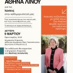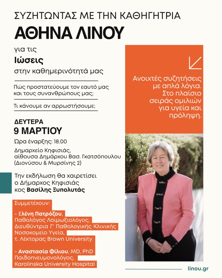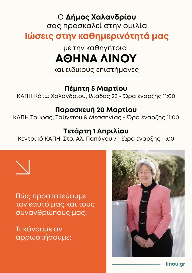 Δύο ομιλίες με θέμα «Ιώσεις στην καθημερινότητά μας», θα υλοποιηθούν με ομιλήτρια την ανεξάρτητη βουλευτή Β1 Βορείου Τομέα Αθηνών, καθηγήτρια Αθηνά Λινού, το προσεχές διάστημα: