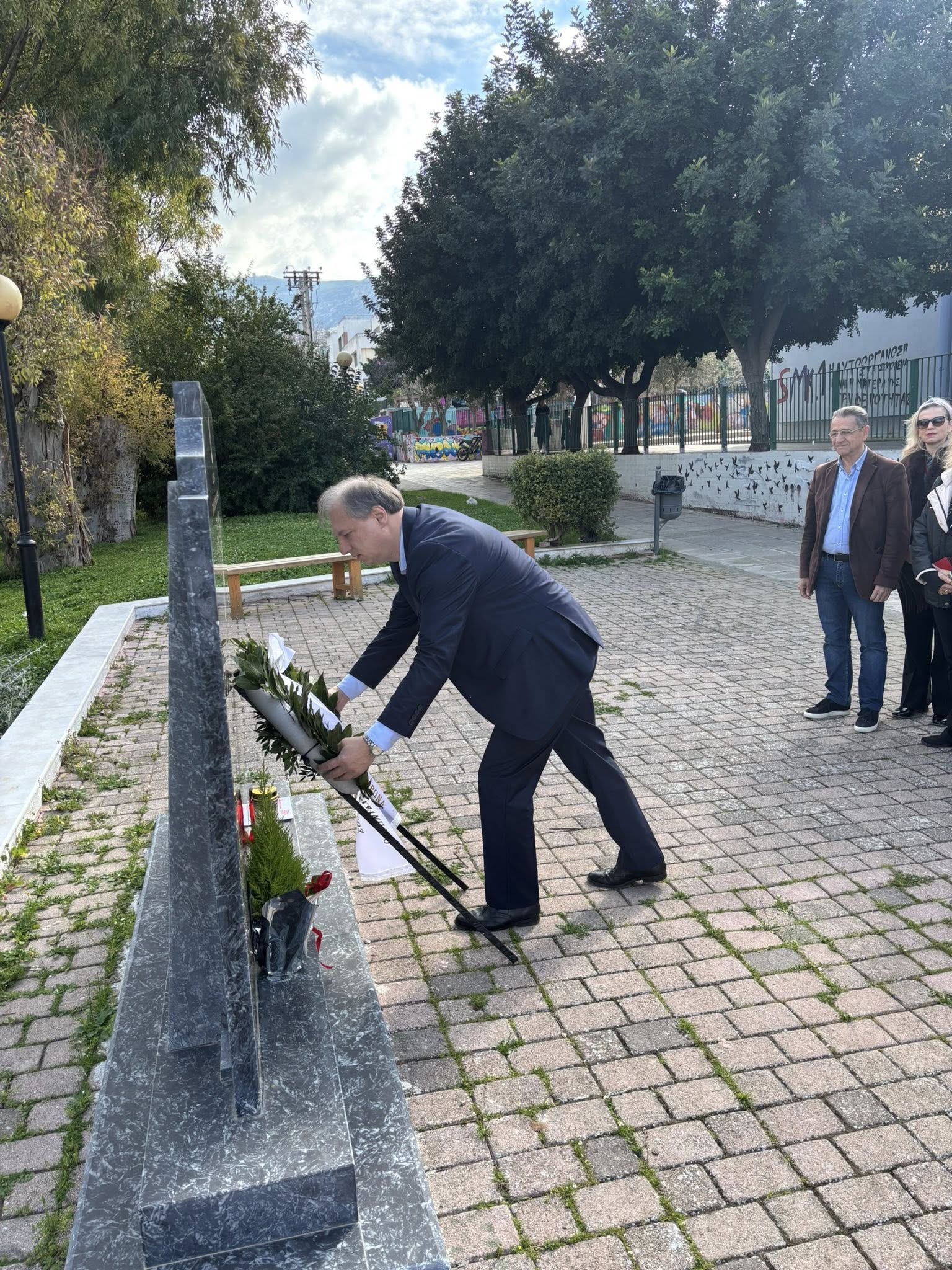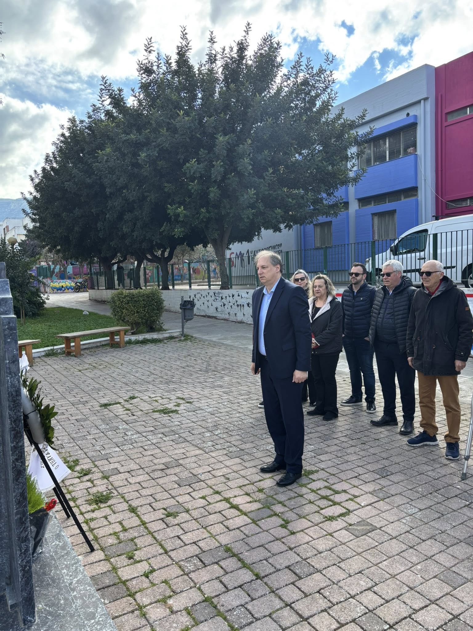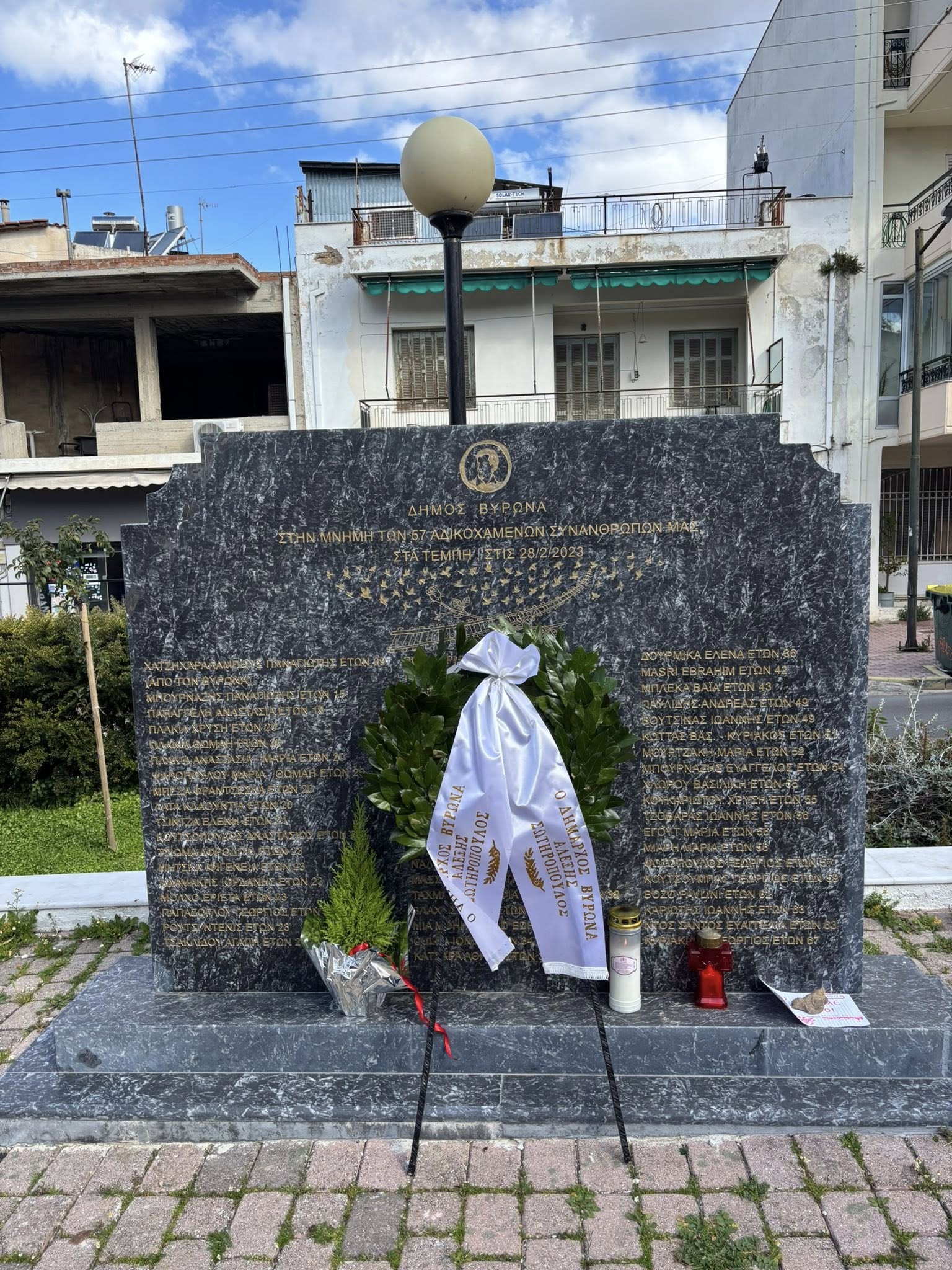 Στεφάνι στο μνημείο που βρίσκεται στην οδό Ταταούλων, αποτίοντας φόρο τιμής στη μνήμη των 57 συνανθρώπων μας που έχασαν άδικα τη ζωή τους στα Τέμπη, κατέθεσε ο δήμαρχος Βύρωνα, Αλέξης Σωτηρόπουλος, μαζί με αντιδημάρχους και εντεταλμένους συμβούλους, το Σάββατο, 28 Φεβρουαρίου 2026, ανήμερα της επετείου των τριών ετών από το τραγικό δυστύχημα.