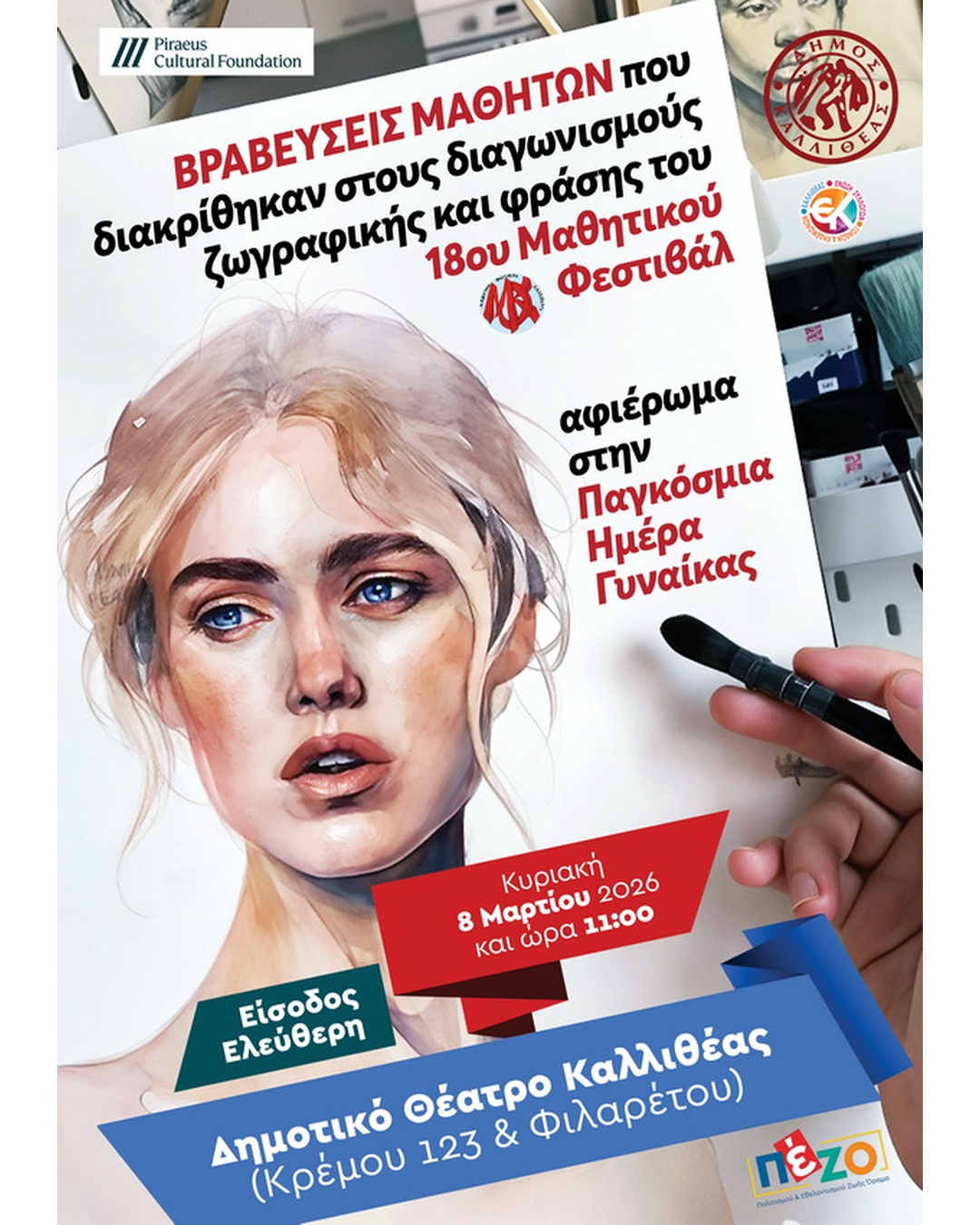 Τους μαθητές που ξεχώρισαν στους διαγωνισμούς ζωγραφικής και δημιουργικής φράσης του 18ου Μαθητικού Φεστιβάλ βραβεύει ο Δήμος Καλλιθέας την Κυριακή 8 Μαρτίου 2026 στις 11:00 π.μ. στο Δημοτικό Θέατρο Καλλιθέας.