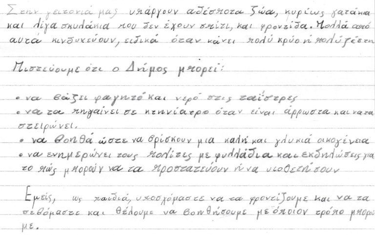 Με δική τους, λοιπόν, πρωτοβουλία, ετοίμασαν μια επιστολή με τις σκέψεις τους για έναν πιο φιλικό Δήμο προς τα ζώα και μια αφίσα που δημιούργησαν οι ίδιοι, με σκοπό την ευαισθητοποίηση των συμπολιτών τους.