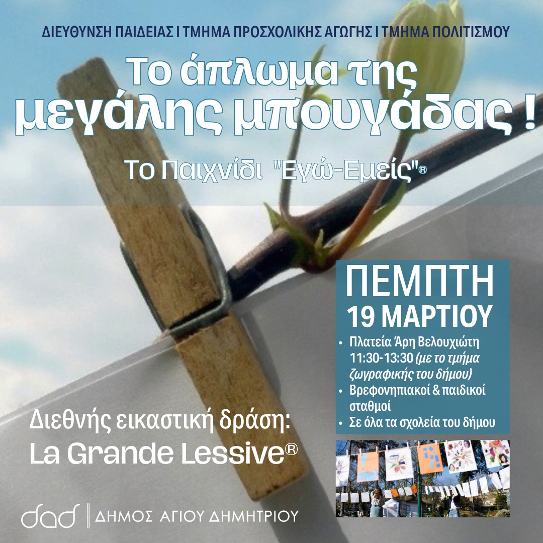 Στην παγκόσμια καλλιτεχνική δράση «Η Μεγάλη Μπουγάδα/ La Grande Lessive», συμμετέχουν για μία ακόμη χρονιά οι βρεφονηπιακοί και παιδικοί σταθμοί αλλά και τα σχολεία του Αγίου Δημητρίου.