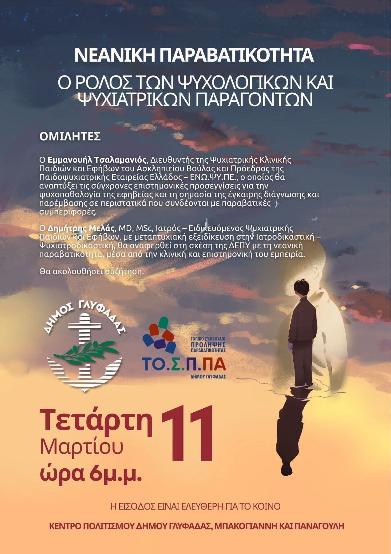 Η εκδήλωση, με τίτλο «Νεανική Παραβατικότητα: Ο ρόλος των Ψυχολογικών και Ψυχιατρικών Παραγόντων», οργανώνεται από το Τοπικό Συμβούλιο Πρόληψης Παραβατικότητας Ανηλίκων Δήμου Γλυφάδας, υπό τον συντονισμό της προέδρου του και αντιδημάρχου Κοινωνικής Μέριμνας και Αλληλεγγύης Ελένη Καράχου‑Σκούταρη.