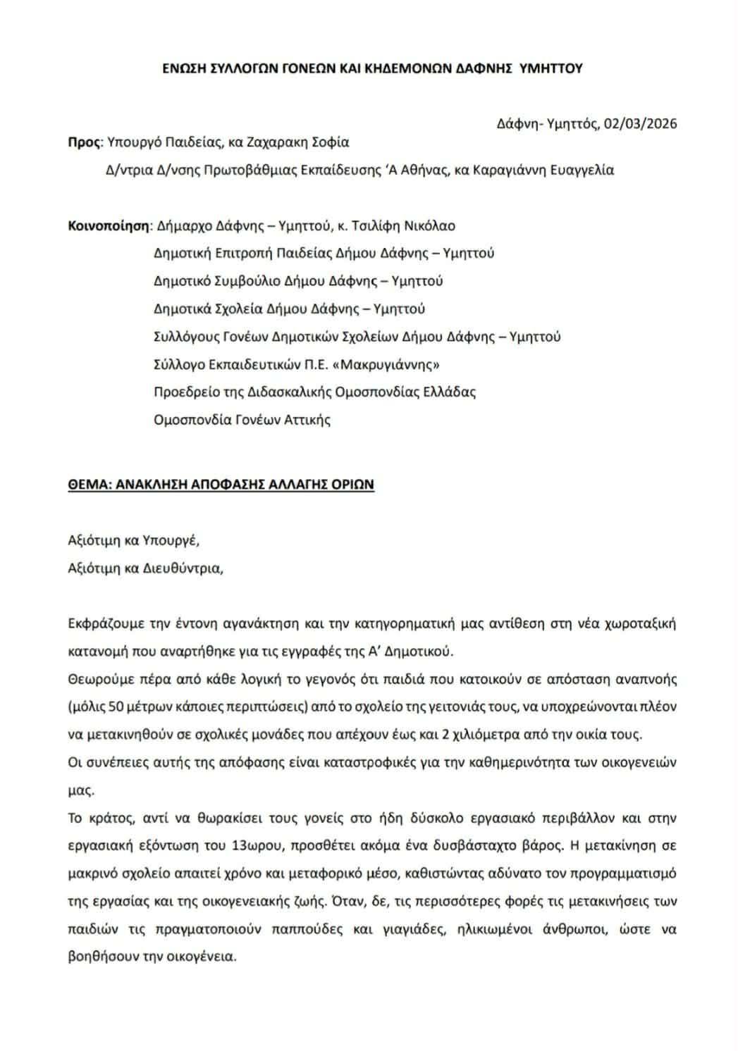 Με μια σκληρή επιστολή προς την υπουργό Παιδείας, Σοφία Ζαχαράκη, η Ένωση Συλλόγων Γονέων και Κηδεμόνων της περιοχής εκφράζει την έντονη αγανάκτησή της, κάνοντας λόγο για μια απόφαση «πέρα από κάθε λογική».
