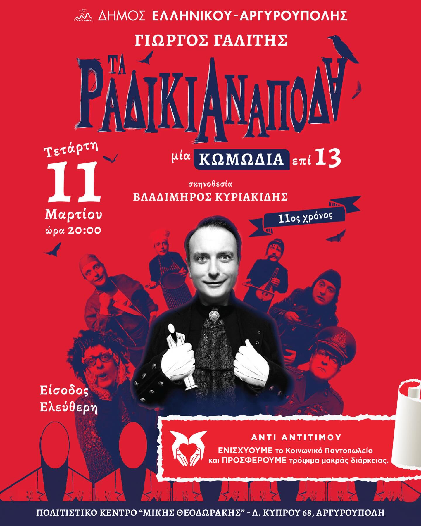 Την θεατρική επιτυχία του Γιώργου Γαλίτη, «Τα Ραδίκια Ανάποδα», φιλοξενεί την Τετάρτη 11 Μαρτίου, στις 20:00, ο Δήμος Ελληνικού – Αργυρούπολης, και το «Πολιτιστικό Κέντρο Μίκης Θεοδωράκης» (Λ. Κύπρου 68, Αργυρούπολη).