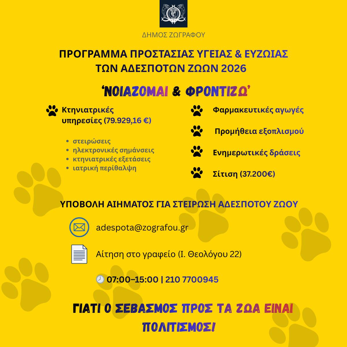 Αναφέροντας αδέσποτα για στείρωση στο τηλέφωνο 210 7700945 ή μέσω email στο adespota@zografou.gr. Πληροφοριακά, το γραφείο του Δήμου (Ιωάννου Θεολόγου 22) παραμένει ανοιχτό για το κοινό καθημερινά 07:00 έως και 15:00.