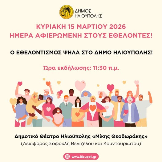 Η εκδήλωση που θα λάβει χώρα στο δημοτικό θέατρο «Μίκης Θεοδωράκης» (Λεωφόρος Σοφοκλή Βενιζέλου και Κουντουριώτου), στις 11:30 π.μ. θα φέρει το σύνθημα «Ο εθελοντισμός ψηλά στο Δήμο Ηλιούπολης».