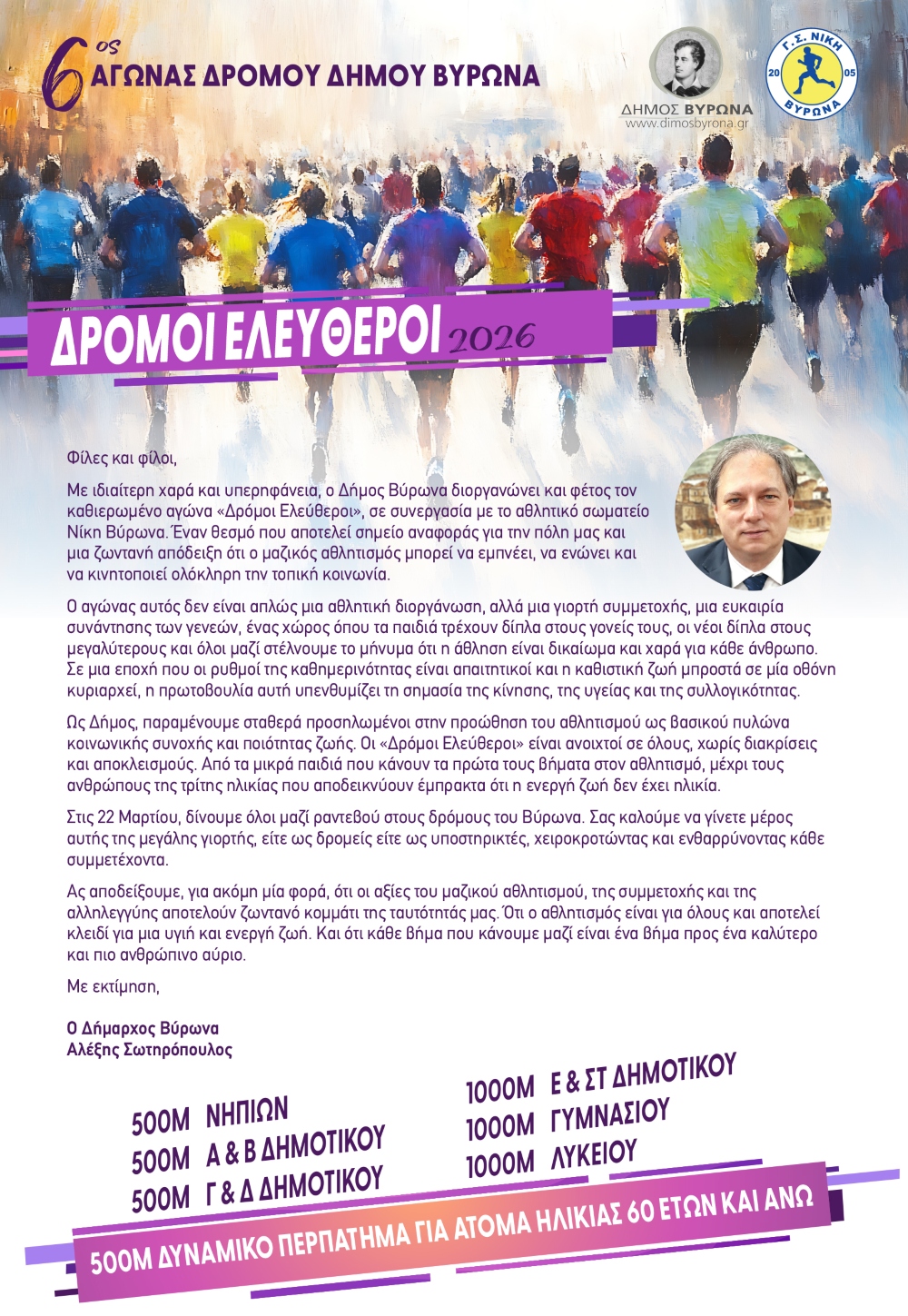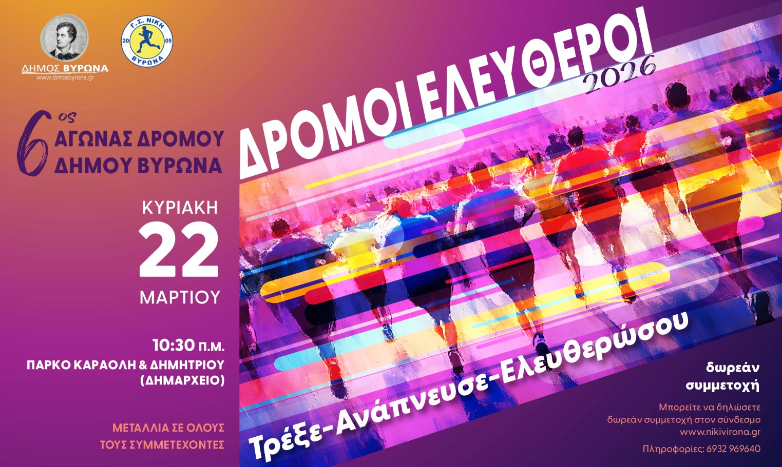 Την Κυριακή 22 Μαρτίου 2026 θα πραγματοποιηθεί ο 6ος Αγώνας Δρόμου «Δρόμοι Ελεύθεροι» που διοργανώνει ο Δήμος Βύρωνα, σε συνεργασία με τον Γυμναστικό Σύλλογο «Νίκη Βύρωνα».