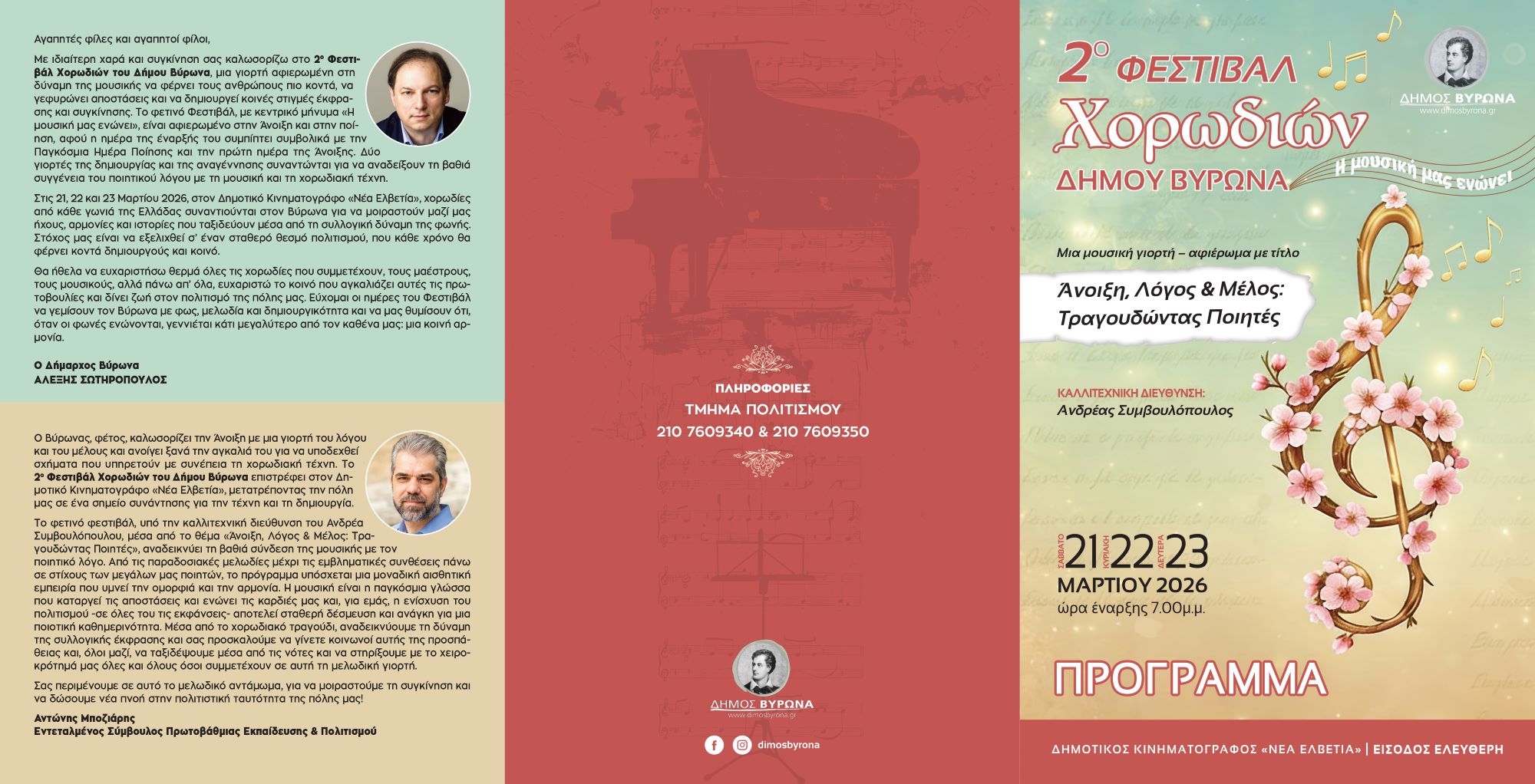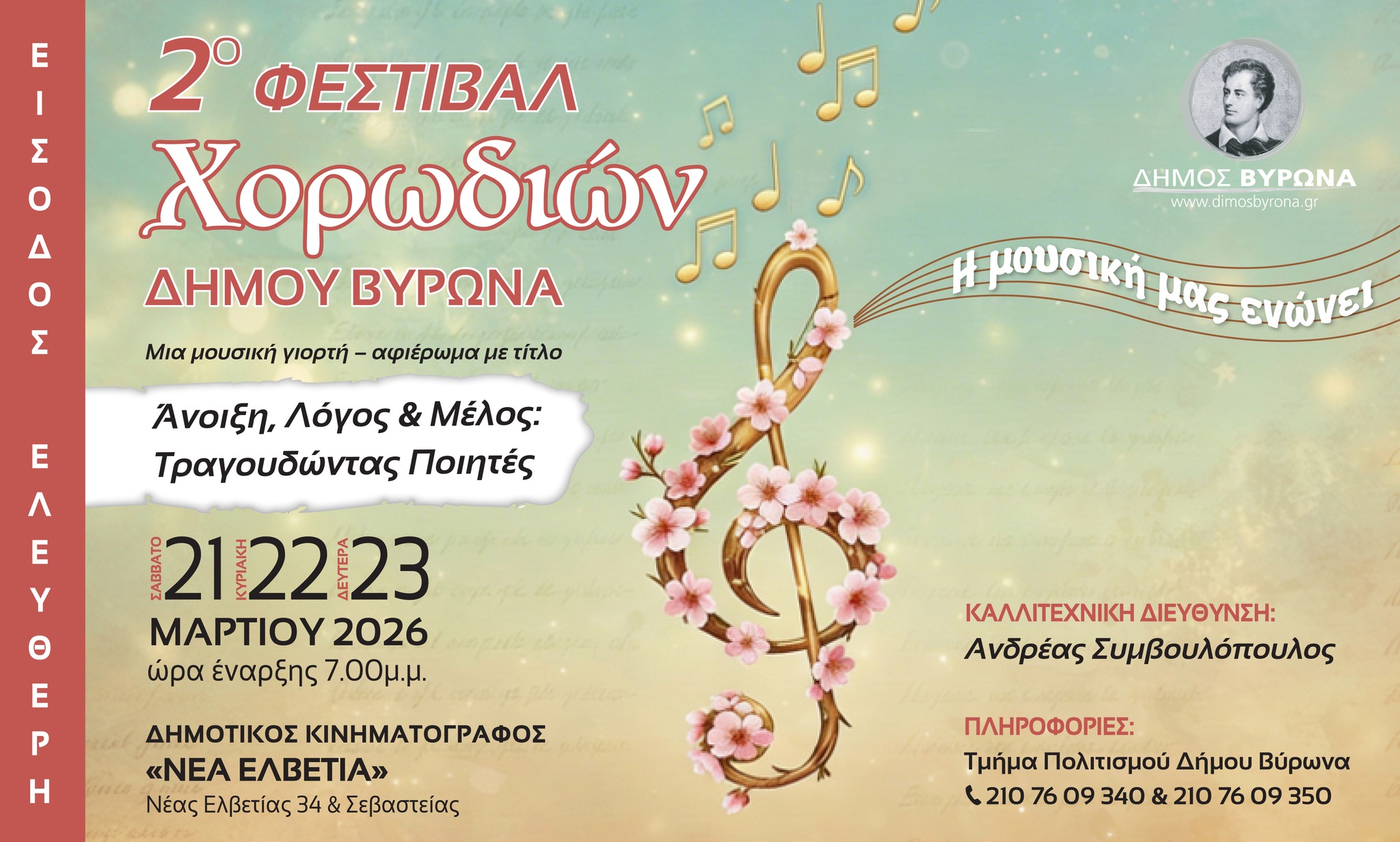 Ακολουθώντας την μεγάλη επιτυχία του 1ου Φεστιβάλ Χορωδιών, που πραγματοποιήθηκε πέρυσι, το φεστιβάλ επιστρέφει και φέτος στην πόλη, φέρνοντας στον Βύρωνα μία τριήμερη μουσική γιορτή αφιερωμένη στη δύναμη της συλλογικής έκφρασης και στη συνάντηση της ποίησης με τη μουσική.