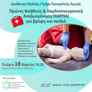 Το σεμινάριο θα επικεντρωθεί στις Πρώτες Βοήθειες και στην Καρδιοπνευμονική Αναζωογόνηση (ΚΑΡΠΑ) για βρέφη και παιδιά και θα πραγματοποιηθεί την Τετάρτη 18 Μαρτίου και ώρα 16:30, στο Δημοτικό Θέατρο «Μελίνα Μερκούρη».