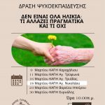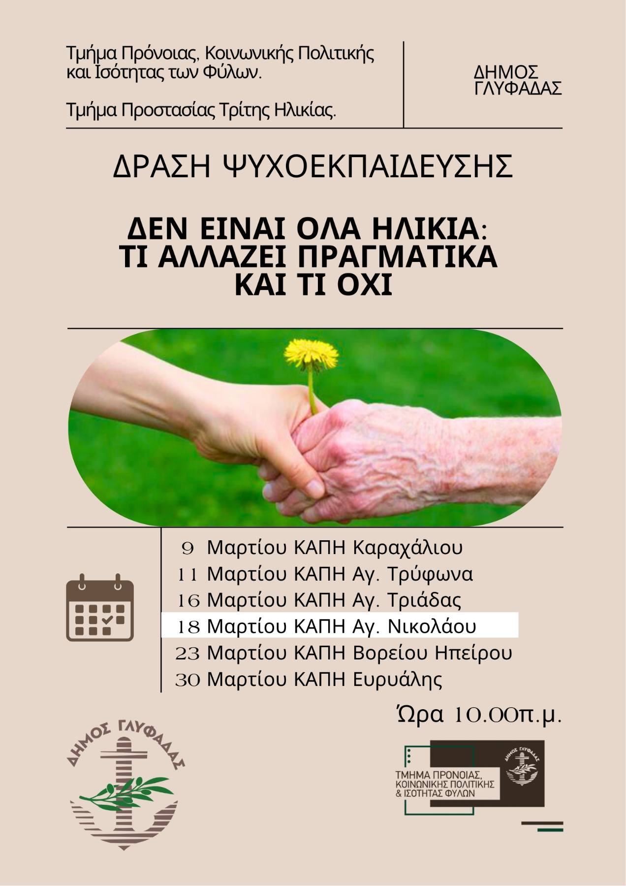 Μετά τις επιτυχημένες συναντήσεις στο ΚΑΠΗ Καραχάλιου, Αγίου Τρύφωνα και Αγίας Τριάδας, η δράση συνεχίζεται την Τετάρτη 18 Μαρτίου, στις 10:00 το πρωί, στο ΚΑΠΗ Αγίου Νικολάου.