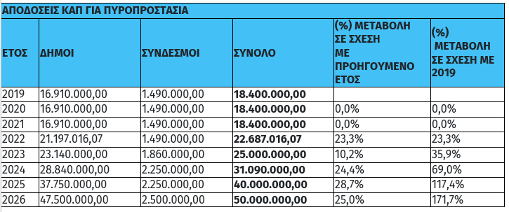 Χρηματοδότηση ύψους 50 εκατ. €, αυξημένη κατά 10 εκατ. € (25%) σε σχέση με το 2025, διατίθεται από το Υπουργείο Εσωτερικών προς τους Δήμους και τους Συνδέσμους τους για την υλοποίηση δράσεων πυροπροστασίας το 2026.