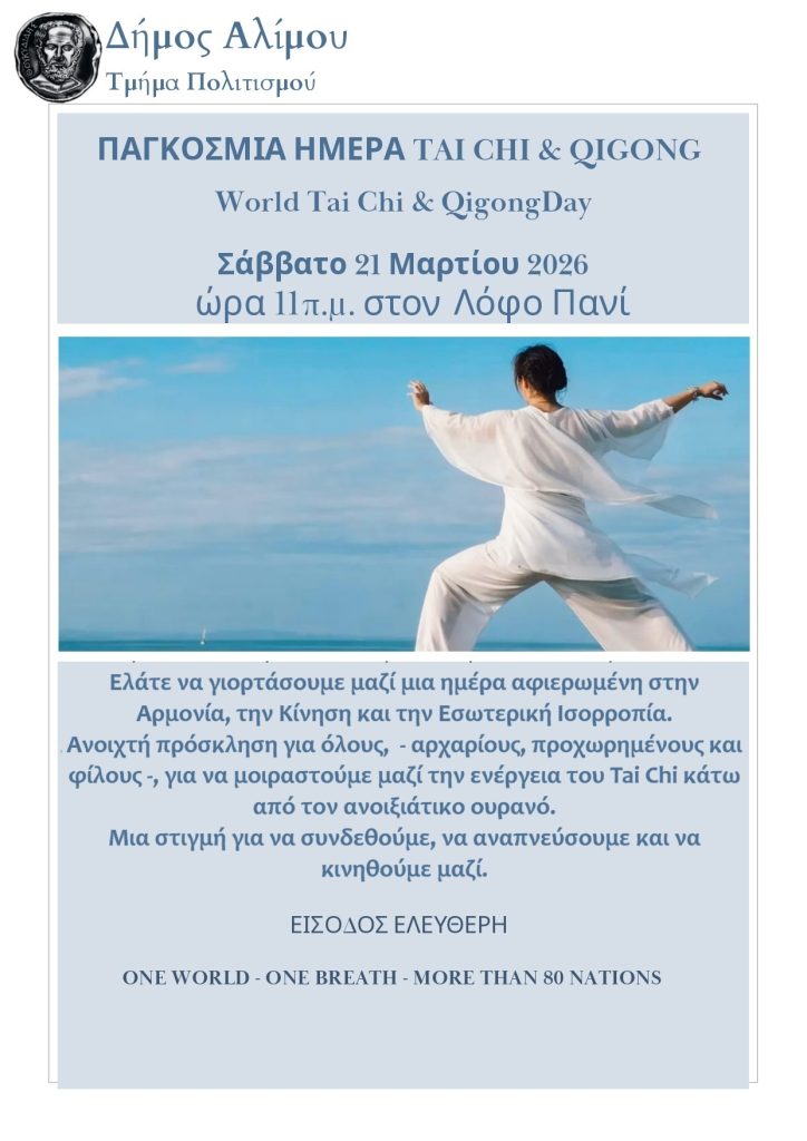Με αφορμή την Παγκόσμια Ημέρα Tai Chi και Qigong, ο Δήμος Αλίμου διοργανώνει ένα δωρεάν μάθημα κάτω από τον ανοιξιάτικο ήλιο.