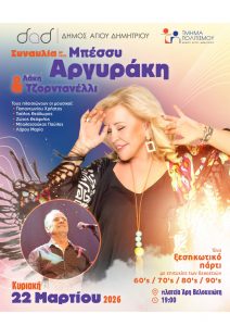Ένα ξεχωριστό μουσικό βράδυ υπόσχεται ο Δήμος Αγίου Δημητρίου την Κυριακή 22 Μαρτίου, με τη συναυλία της Μπέσσυ Αργυράκη και του Λάκης Τζορντανέλλι στην πλατεία Άρη Βελουχιώτη.