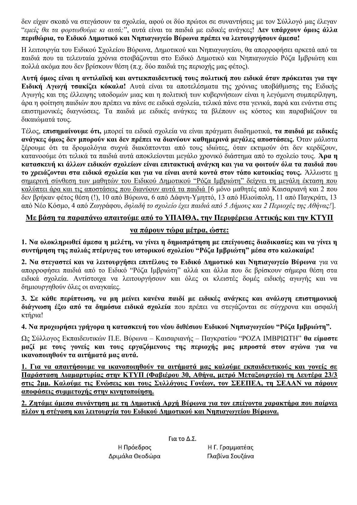 Επιπλέον, να στεγαστούν και να λειτουργήσουν άμεσα το Ειδικό Δημοτικό & Νηπιαγωγείο Βύρωνα.