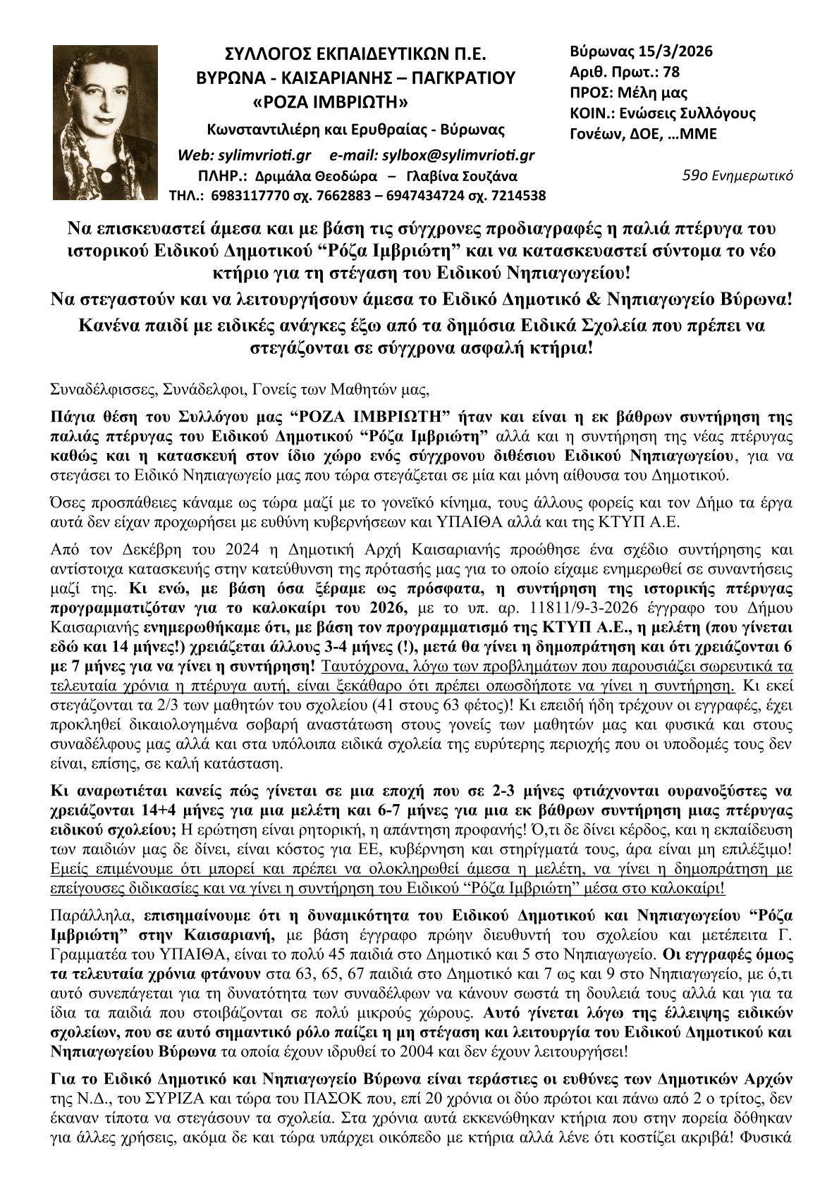 Ο Σύλλογος διεκδικεί την άμεση επισκευή και με βάση τις σύγχρονες προδιαγραφές της παλιάς πτέρυγας του ιστορικού Ειδικού Δημοτικού «Ρόζα Ιμβριώτη» καθώς και την κατασκευή νέου κτηρίου για τη στέγαση του Ειδικού Νηπιαγωγείου.
