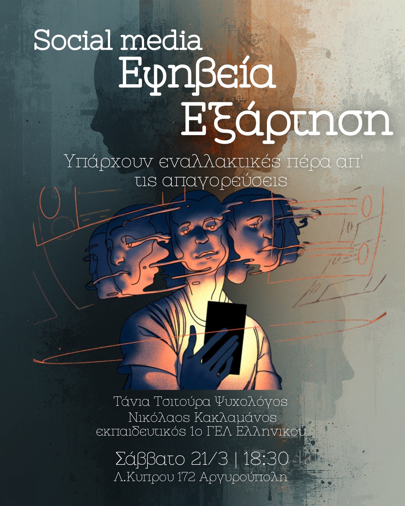 Στην εκδήλωση – συζήτηση, που φέρει τον τίτλο «Social Media: Εφηβεία και Εξάρτηση», θα μιλήσουν η ψυχολόγος Τάνια Τσίτουρα και ο εκπαιδευτικός Νίκος Κακλαμάνος, επιδιώκοντας να απαντήσουν τα εξής ερωτήματα που συχνά αποσιωπώνται: